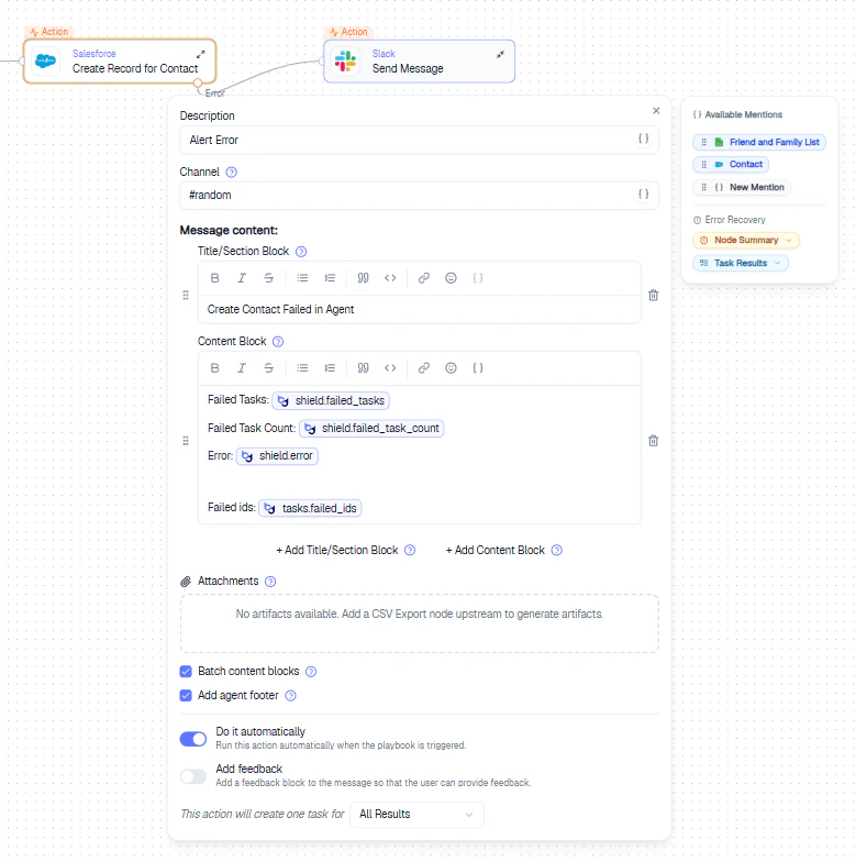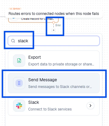 When the shield is enabled, an Error Route appears on the node. Click + on the Error Route and select an alert action (e.g., Slack Message).