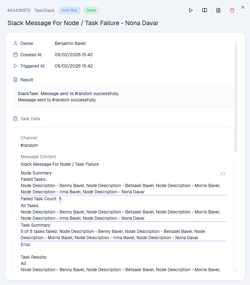 | Task Results | Detailed execution data (error messages, response info) |