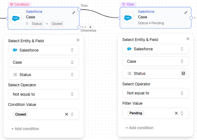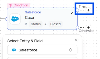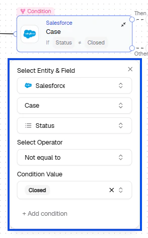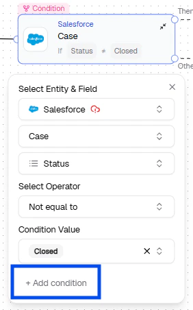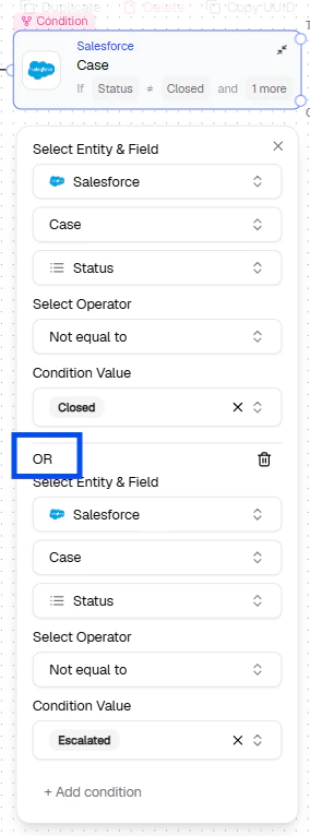 - OR — Add a condition to the existing node from + Add condition