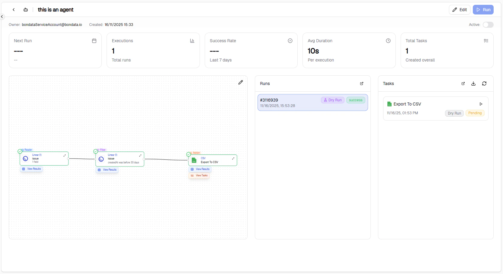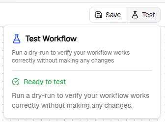 Click Test (top right) to simulate the Agent without performing any actions. Task previews appear in the right panel.