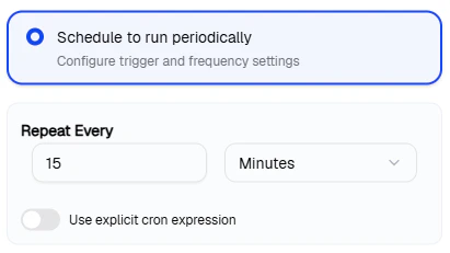 - Schedule — runs on a recurring frequency (e.g., every 15 minutes, or a custom cron expression)