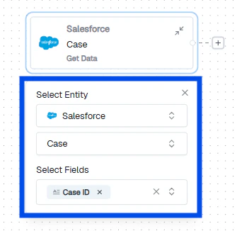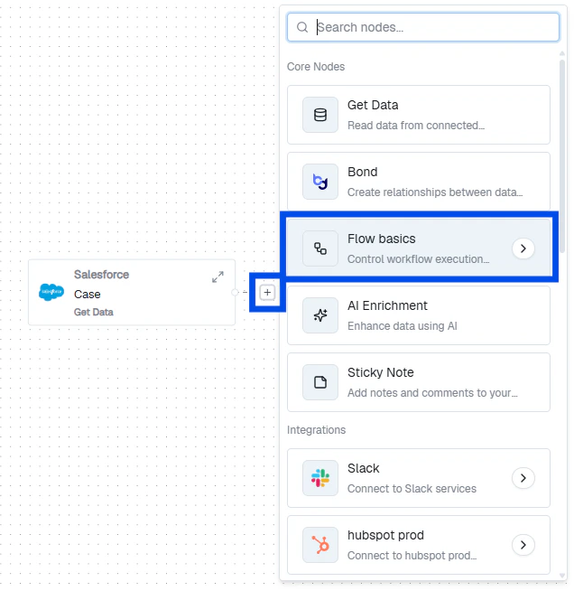 Click + to add your first node — always a Get Data node. Select the integration, entity, and fields to monitor.
