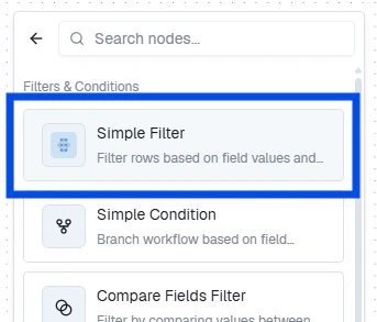 Click + > Flow Basics and select Simple Filter. Set the entity, field, operator, and value.