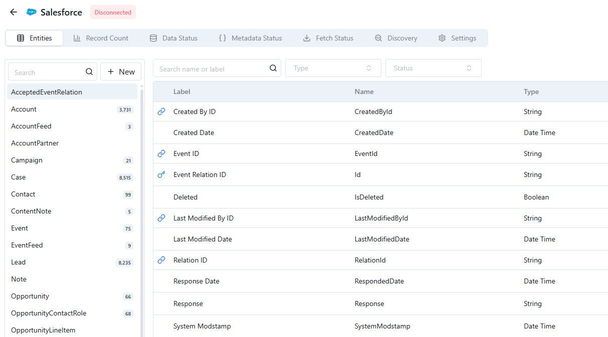 Standard objects (e.g., Salesforce Accounts, Contacts) are included by default. To add custom objects:- Click New at the top of the entity list