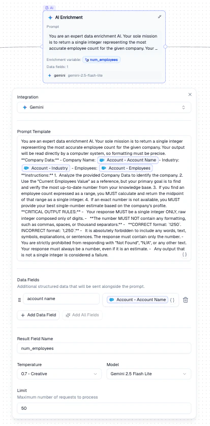 Enrich Salesforce Accounts with employee count estimates:- Set the prompt to instruct the LLM to return an employee count