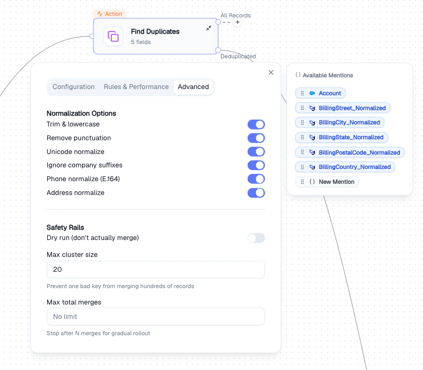- Data Normalization — clean field values before duplicate detection for better accuracy