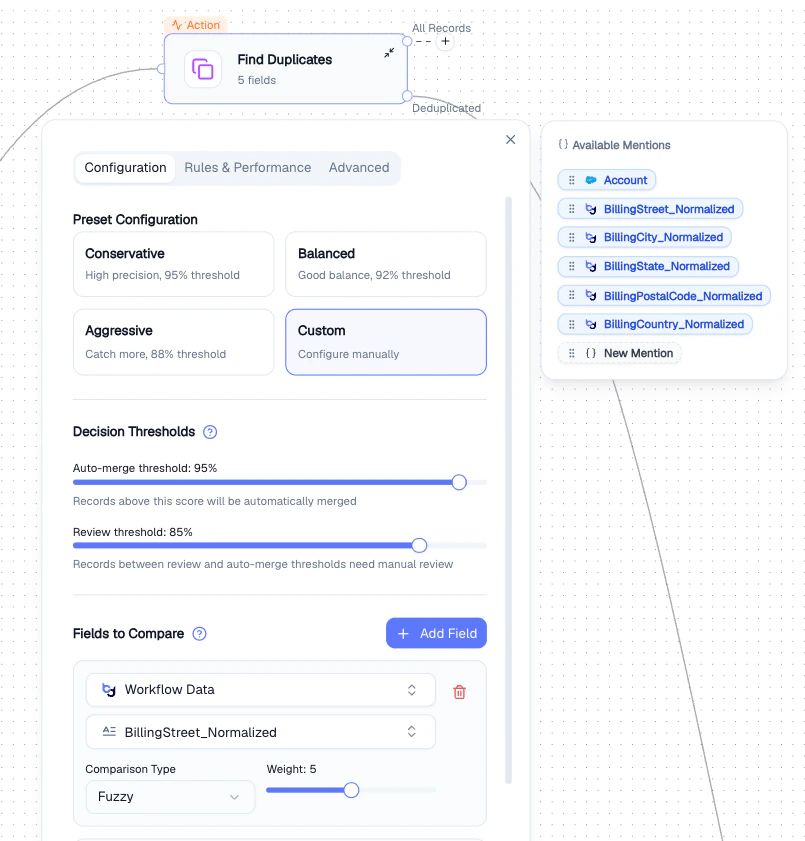 | Fields to Compare | Select fields and set comparison type (Fuzzy or Exact) and weight |