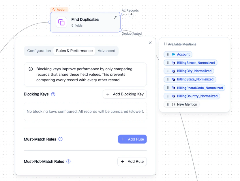| Must-Match Rules | Records must match on these fields to be considered duplicates |