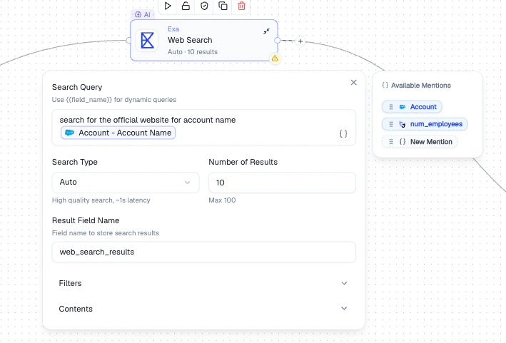 A new field containing the search results is added to each record. The field becomes available as a Mention in all downstream nodes.Best Practices
